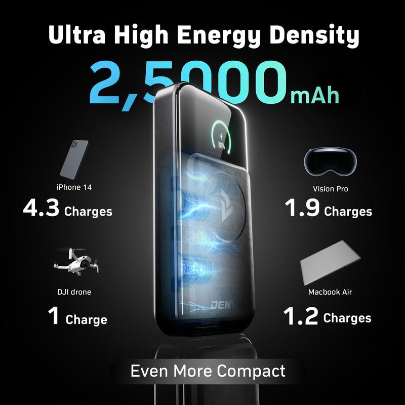 Despite its compact, palm-sized design, it boasts a robust 25,000mAh capacity, able to power up an iPhone 14 4.3 times, a MacBook Air (M2) 1.2 times, a DJI Air 3 drone 1 time, or a Vision Pro 1.9 times. Perfect for extended trips, or daily use, it keeps devices charged while meeting TSA requirements (91.25Wh