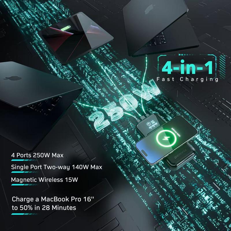 Equipped with two two-way USB-C ports, one USB-A port, and one magnetic wireless charger, the power bank delivers up to 250W powered by PD 3.1 technology. Boost your MacBook Air (M2) to 50% in just 28 minutes. With top heat dissipation technology, it maintains a constant 140W single-port output without overheating.