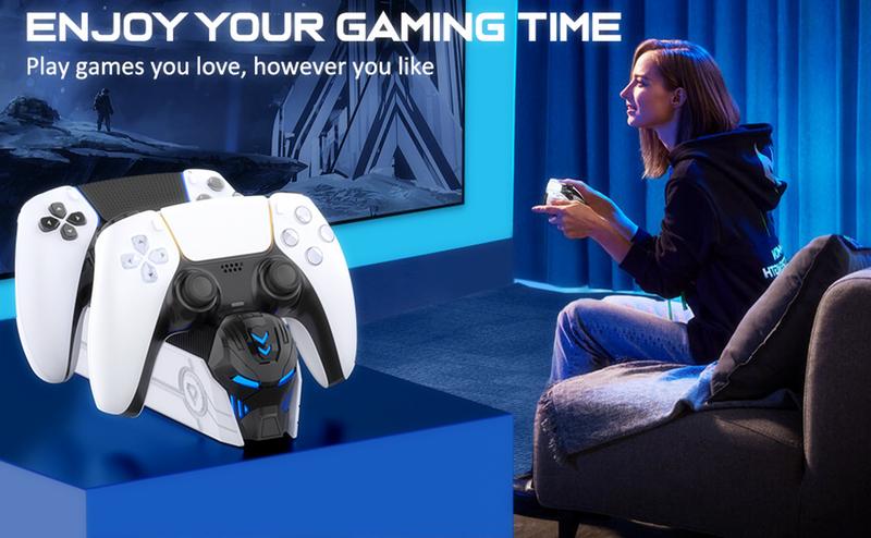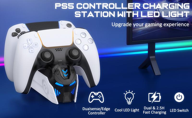 【Special Designed for PS5 Controller DualSense and DualSense Edge】 Specially designed to simultaneously charge up to two DualSense wireless controllers, this charger station is also compatible with DualSense Edge controllers. The PS5 controller charger station features LED ambient light, you will notice a significant difference with this ps5 controller accessory kit for the PS5 DualSense.