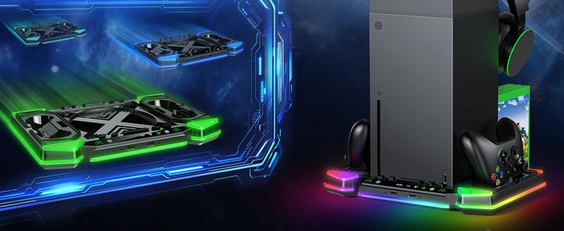✅【Great Accessories for Xbox Series X】 — This accessory integrates multiple functions, including 1 top fan with automatic and manual modes for Xbox Series X console, 1 charger station and 2*1400 mAh rechargeable batteries for Xbox Series X controller, 11 RGB light modes, 1 headset stand, 2 expansion card slots and 6 game disc storage for better game space management. (Note: charge station has no fan but has 4 air intakes!)